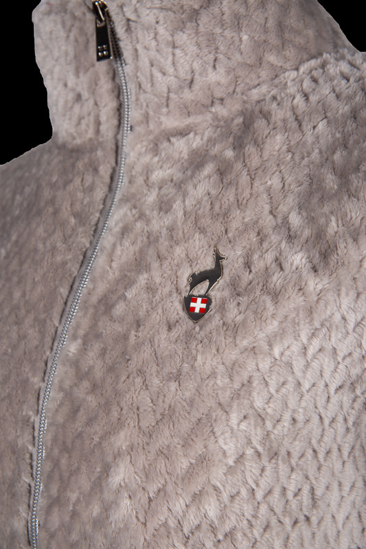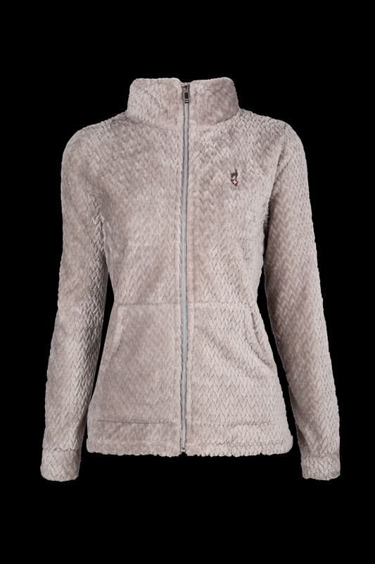 Pletená fleecová bunda, sedlo ze strečového materiálu na bocích, efektní zip uprostřed předního dílu, klokaní kapsy, kovový odznak na hrudi.