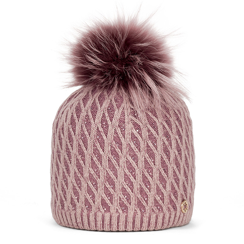 DU JEU FUR. ČEPICE S TONÁLNÍMI KAMÍNKY Svršek: 58 % viskóza, 25 % akryl, 13 % polyamid, 4 % angora Podšívka: 100 % polyester Pom Pon: Materiál: 100% kůže - kožešina - koňské žíně