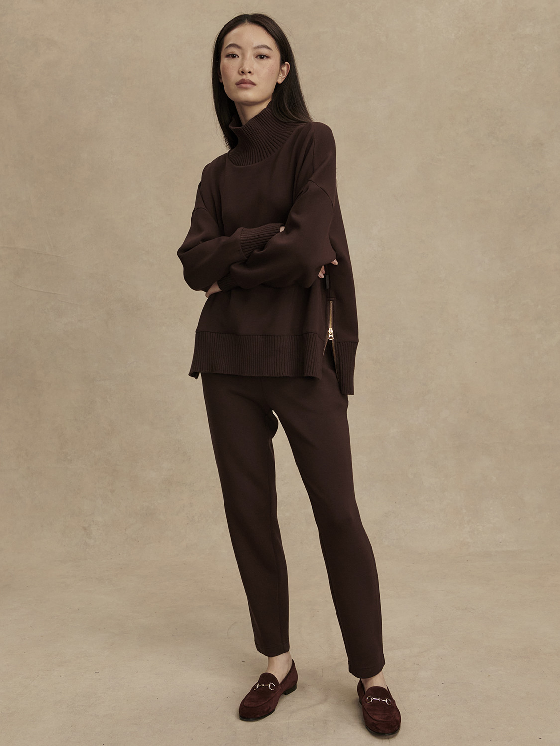 Mikina má volný, mírně boxy střih s vysokým límcem, který dodává sofistikovaný vzhled a zároveň chrání před chladem. Spadlá ramena, široké manžety a jemně prodloužený zadní lem vytvářejí lichotivou siluetu s nenuceným dojmem. Polozip u krku umožňuje přizpůsobit vzhled – zcela zapnutý působí elegantně, rozepnutý uvolněně a sportovně. Barker Sweat se skvěle kombinuje s tepláky, legínami i džíny.