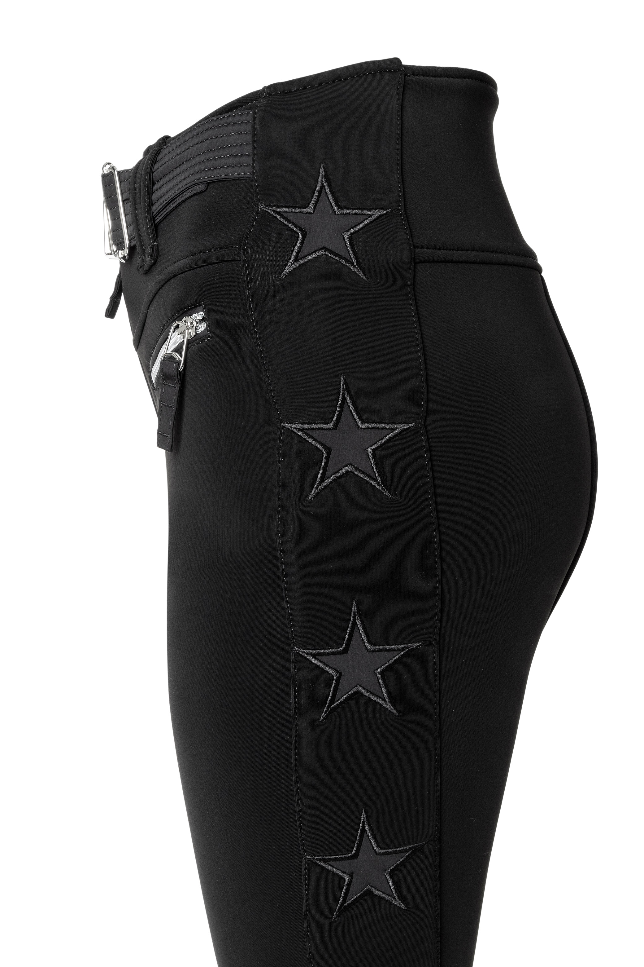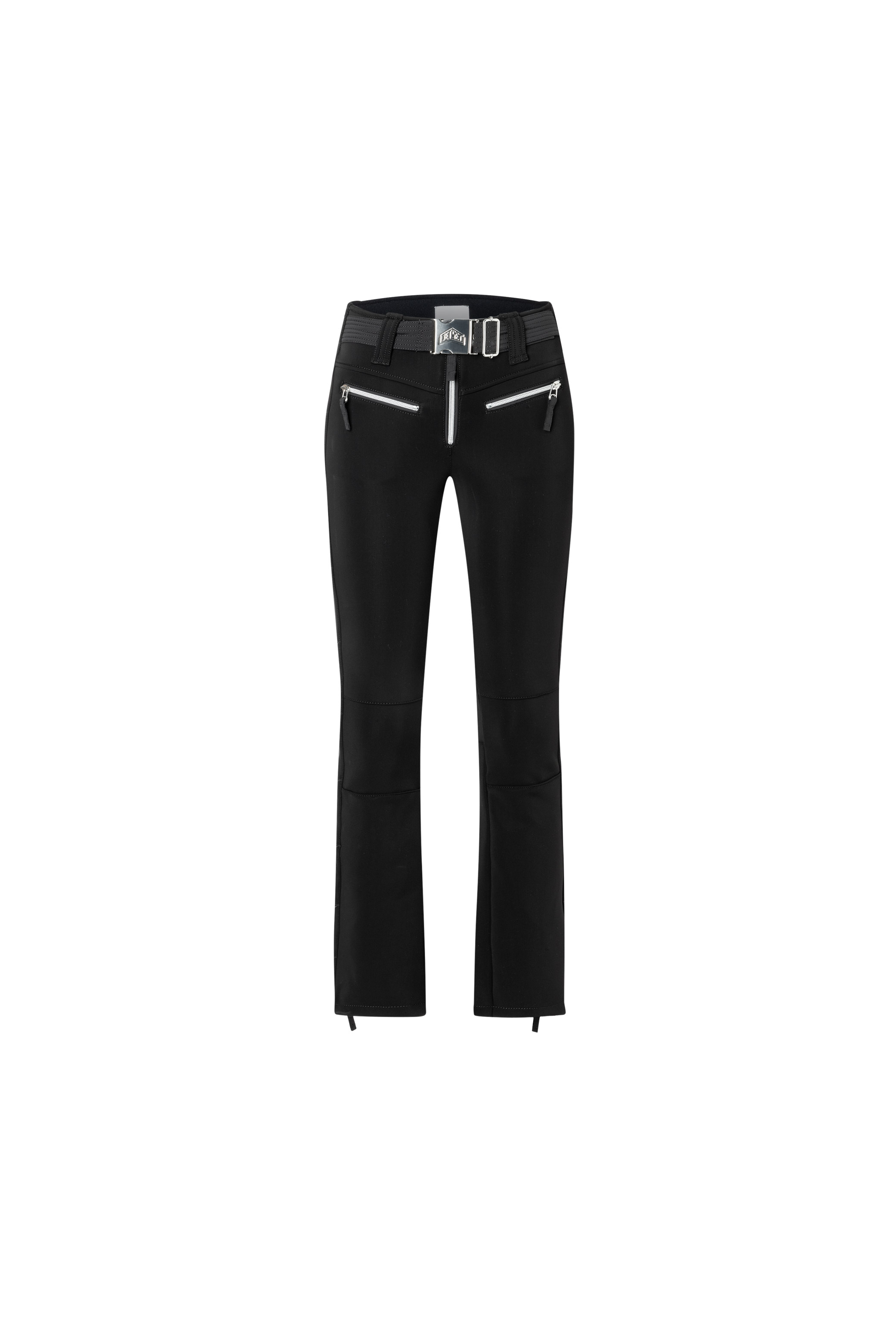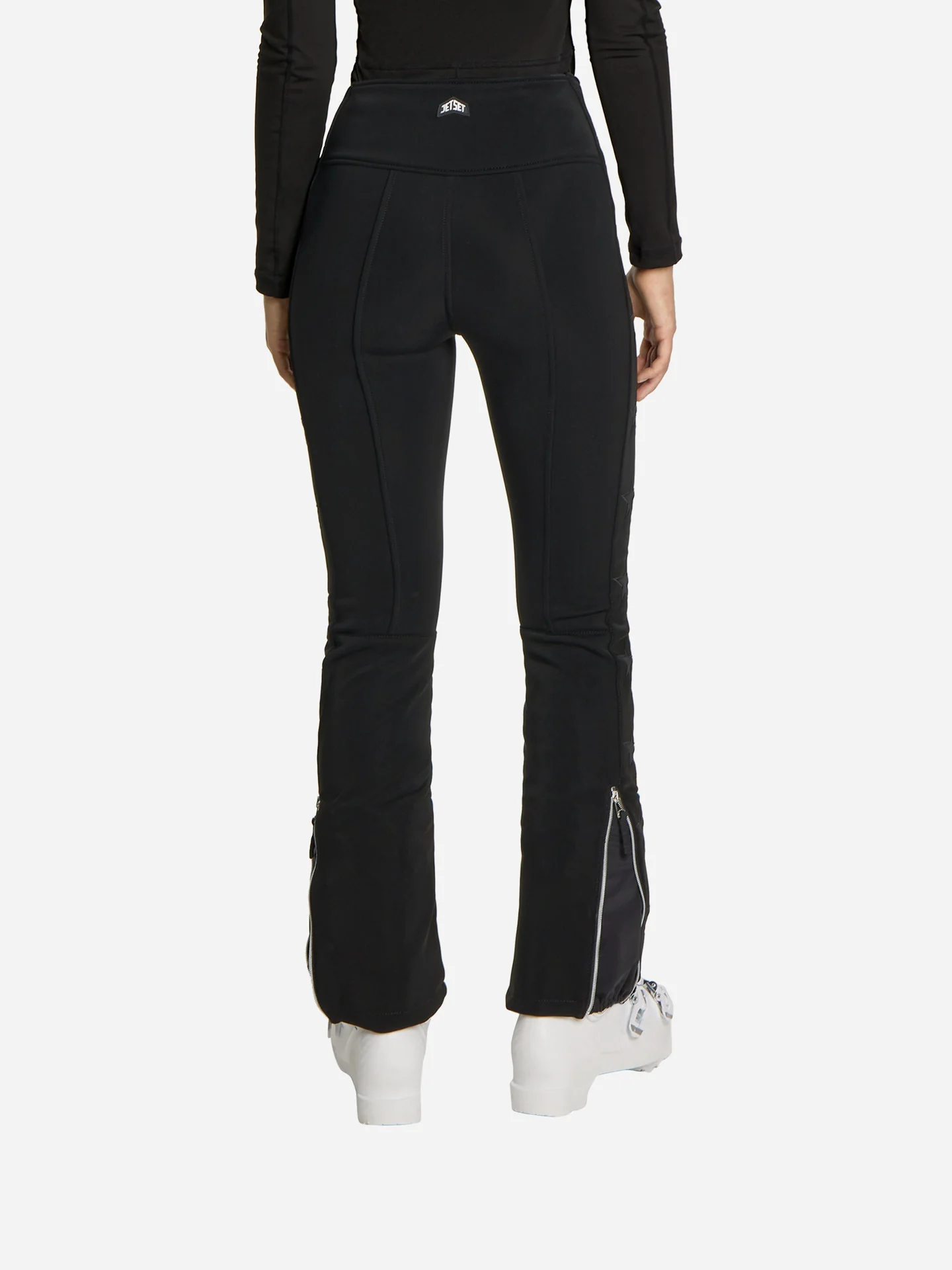 Kalhoty mají zvonový střih, který jemně rozšiřuje nohavice a vytváří stylový efekt — ideální pro módní pojetí lyžařského outfitu. Zadní část pasu je mírně vyšší, což zajišťuje lepší krytí a komfort při pohybu či náklonech. Vysoký pas a všité sněhové kamaše s elastickým lemem zajišťují, že kalhoty drží na svém místě i při agresivním lyžování. Ikonické hvězdy JET SET na boční straně nohavic přinášejí prémiový estetický prvek, zatímco decentní přezka s logem v pase podtrhuje značkový charakter. Dvě přední kapsy na zip a zapínání na zip s jedním knoflíkem a páskovým detailem dokončují stylový, ale funkčně promyšlený vzhled.