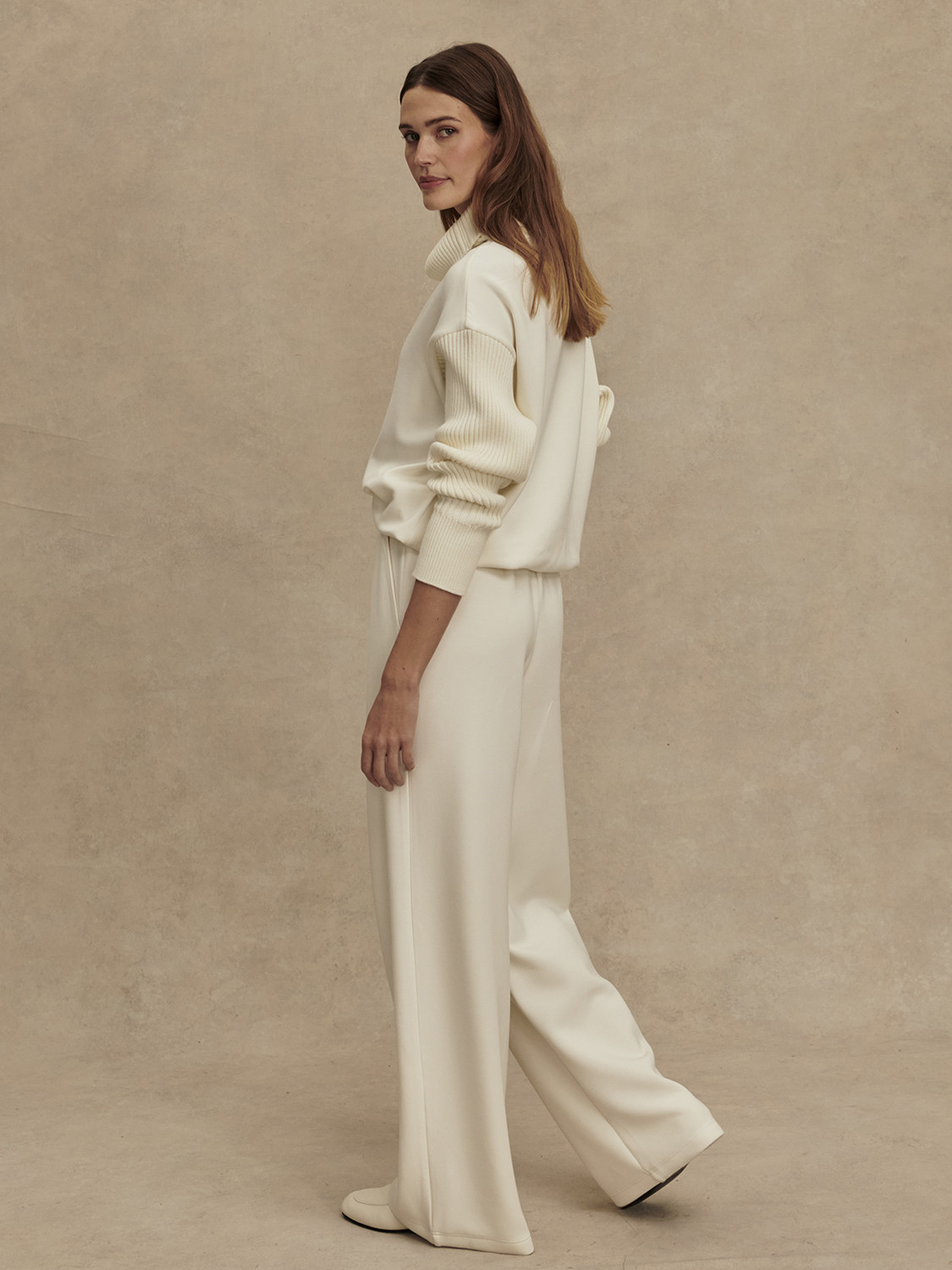Kalhoty mají extra široký střih nohavic, který se výrazně odlišuje od klasického wide-leg modelu a dodává výrazný, módní efekt. Vysoký pas, plissé záhyby vpředu a plochý elastický pas zajišťují komfort i strukturu. Boční kapsy přidávají funkčnost, zatímco hladký přední díl bez výrazných švů zůstává čistý a elegantní. The Extra Wide Leg Pant se hodí k minimalistickým topům nebo oversized mikinám – ideální nejen na volný čas, ale i pro stylově relaxované pracovní dny.