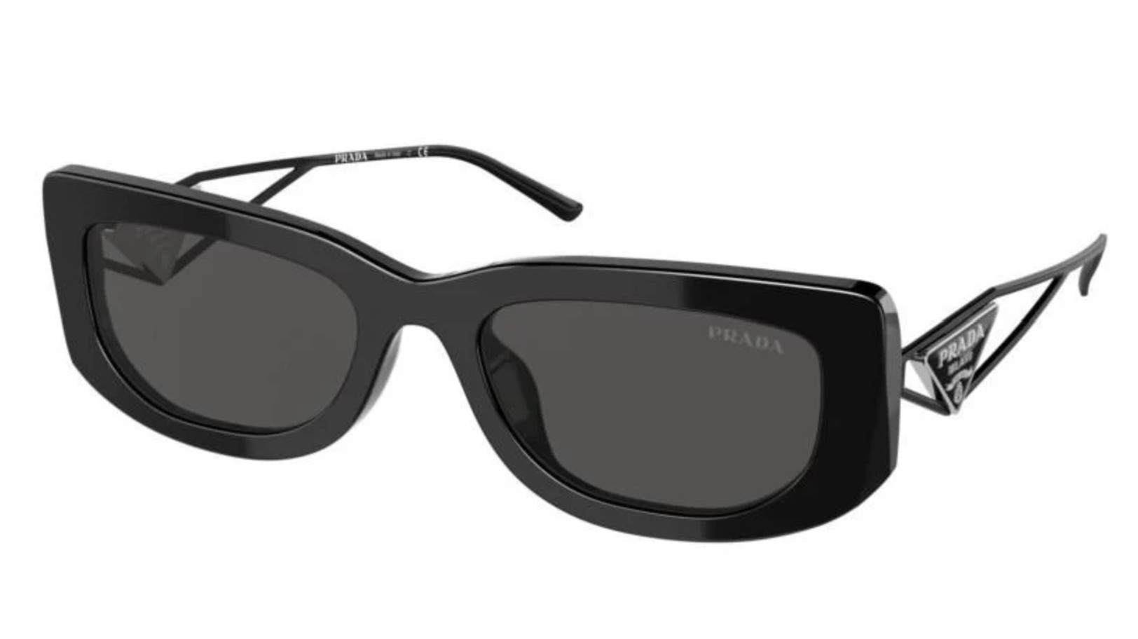 acetátové dámské sluneční brýleZbrusu nová reinterpretace trojúhelníkového loga, která vytváří dokonalou souhru s kolekcí šperků Prada. Trendy silueta a sofistikovaný koncept designu ze smíšeného materiálu pro ikonický a zároveň moderní vzhled. Trendové obdélníkové acetátové brýle s nízkými čočkami vpředu Otevřené celokovové spánky s vloženým trojúhelníkovým logem Prada inspirované doplňky šperků Prada.