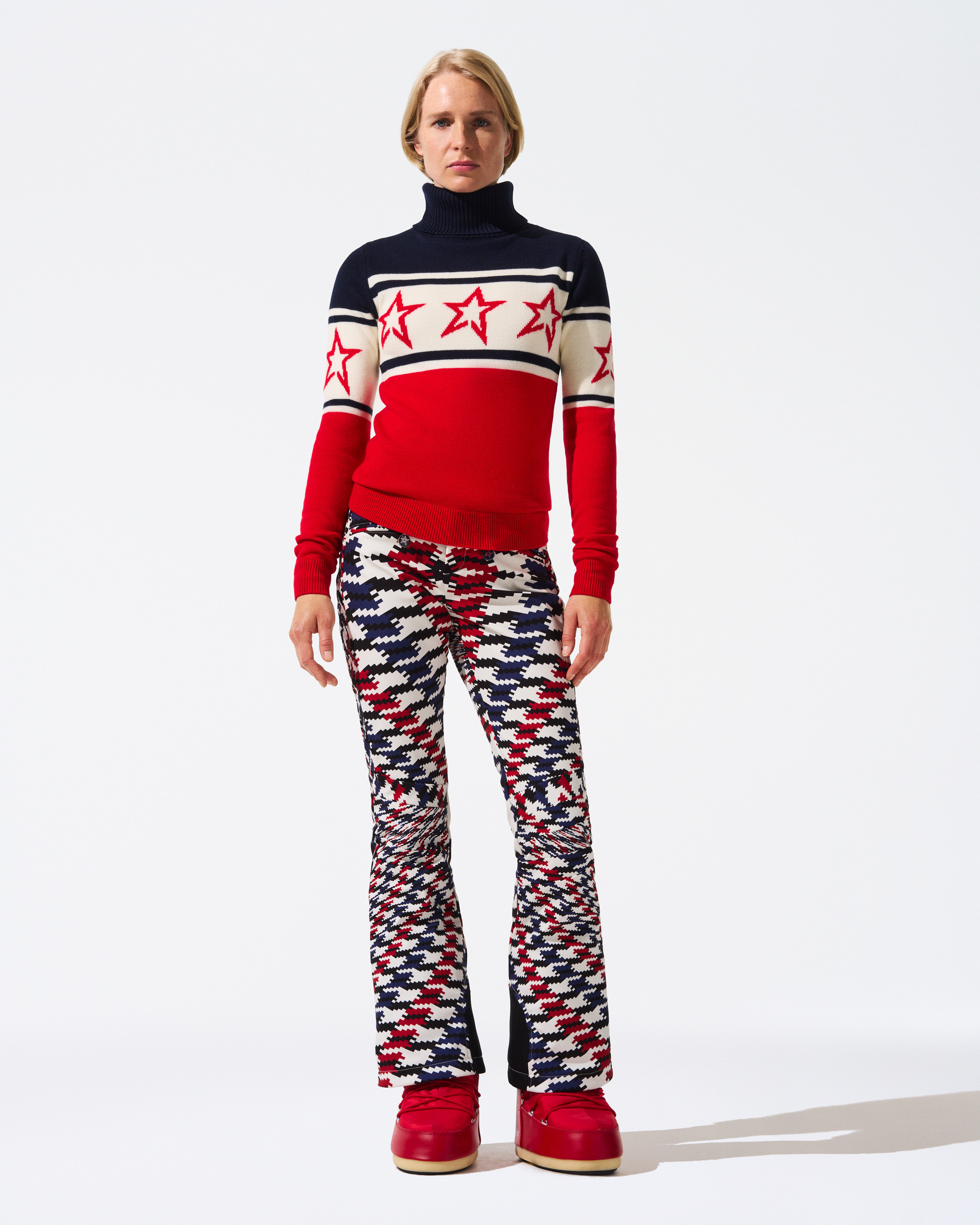 Retro inspirovaný design s výraznou hvězdnou intarzií na hrudi, žebrovaným lemem a manžetami a vysokým rolákem, který příjemně obejme krk. Svetr je navržený tak, aby sahal do úrovně boků a lichotil postavě – ideální k lyžařským kalhotám i k oblíbeným denimům.