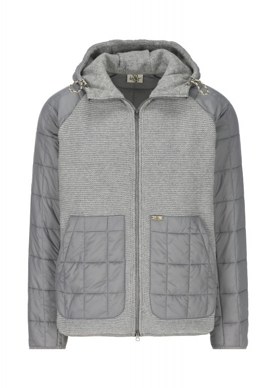 Tato bunda pohodlného střihu s kapucí je vyrobena z čistého nepromokavého nylonu s lehkou výplní ve čtvercovém prošívaném vzhledu. Přední strana je vyrobena ze směsi vlny a pletena tradičním purlovým vzorem, který dodává bundě mimořádně originální nádech.