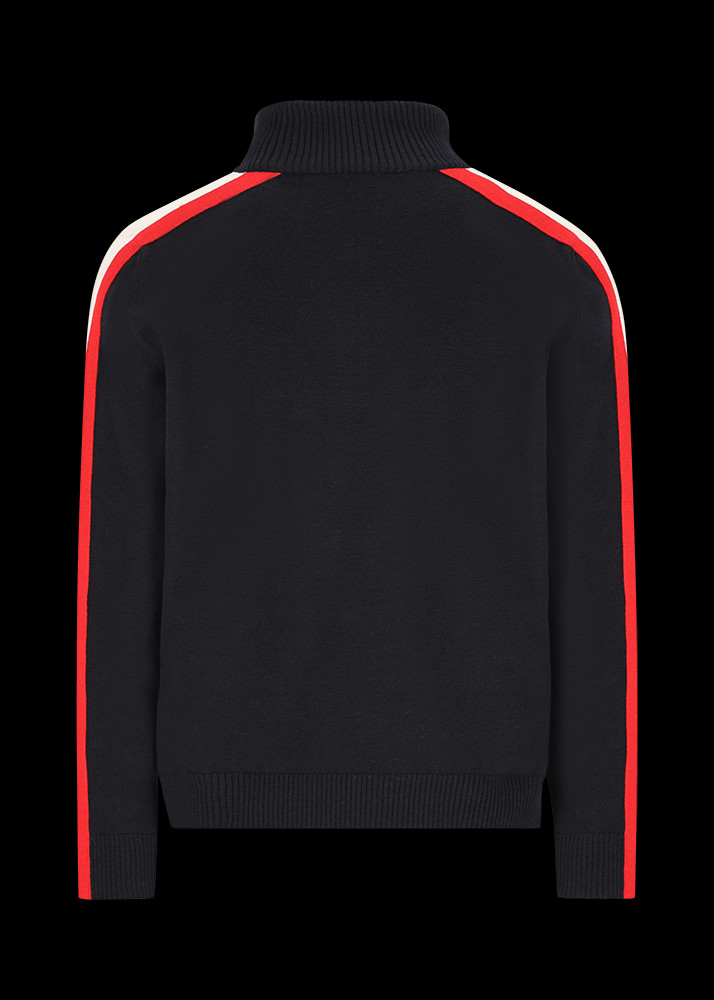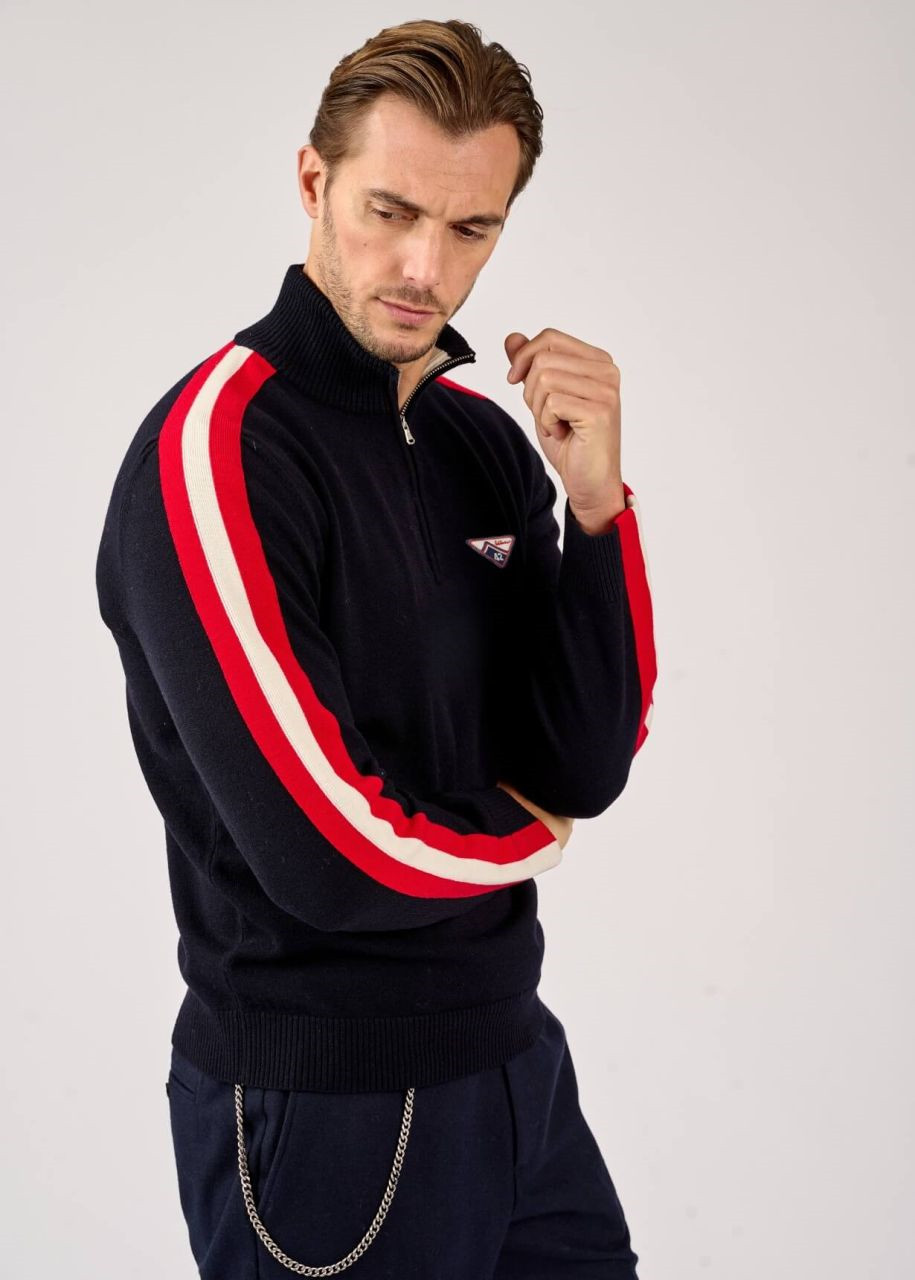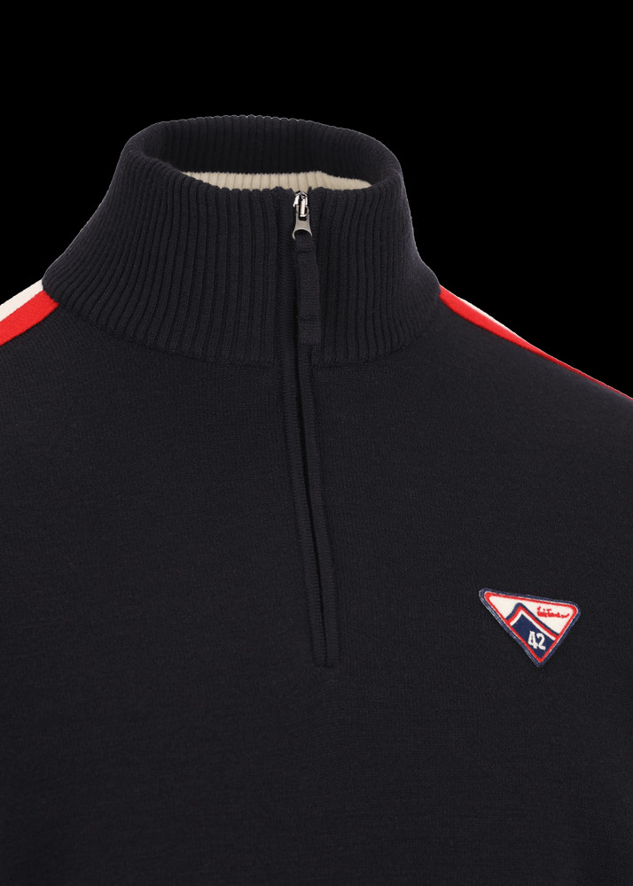 Tento pletený svetr v regular fit střihu se stojáčkem a krátkým zipem je vyroben z příjemné směsi merino vlny a je typickým troyerem – modelem, který původně nosili rybáři, a proto se mu také říká námořnický svetr. Barevný kontrast na límci, červené pruhy na rukávech a malá nášivka na levé straně hrudníku, která odkazuje na ikonické číslo 42 – startovní číslo Luise Trenkera ve všech lyžařských závodech – mu dodávají sportovní nádech.