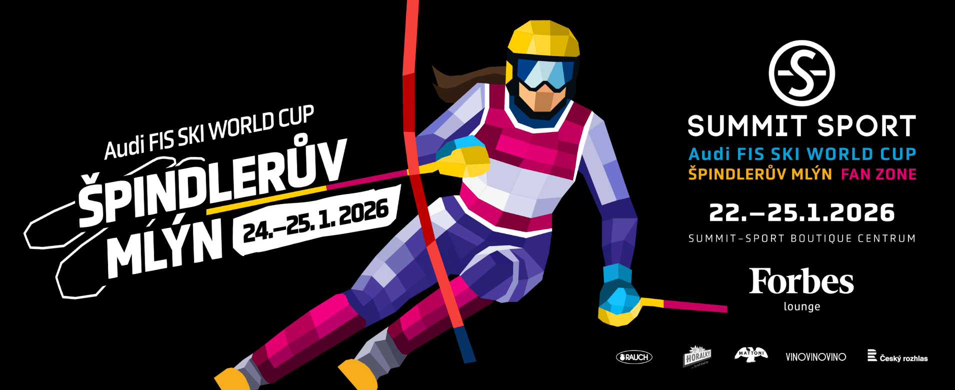 SUMMIT-SPORT AUDI FIS SKI WORLD CUP ŠPINDLERŮV MLÝN FAN ZONE22. - 25. ledna 2026 Do Špindlu míří nejlepší lyžařky světa na světový pohár AUDI FIS SKI WORLD CUP ŠPINDLERŮV MLÝN před olympijskými hrami v Cortině & SUMMIT-SPORT bude samozřejmě u toho. Srdečně Vás zveme do naší oficiální SUMMIT-SPORT Audi FIS Ski World Cup Fan Zone ve spolupraci s Forbes & dalšími partnery. Těšit se můžete na: ▪️ zajímavé rozhovory & hosty